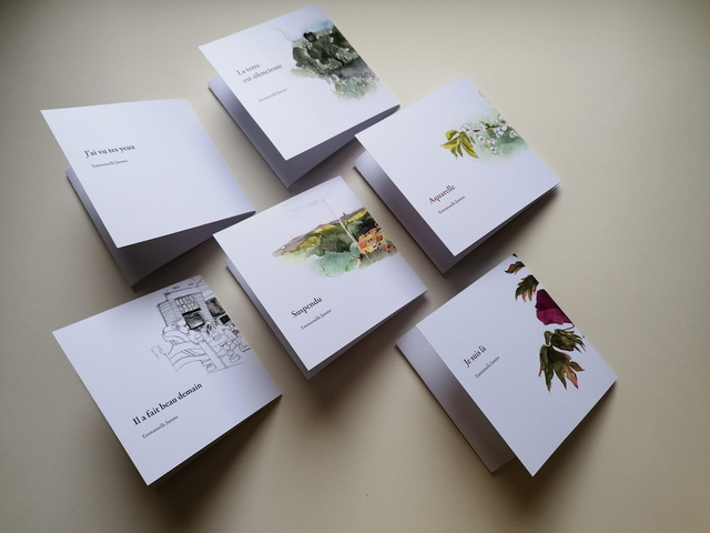 "Aquarelle", Un leporello (petit livre plié) avec un dessin numérisé issu de mes carnets de bord et un de mes poèmes, plié en 3 et enveloppée dans une pochette individuelle, à s'offrir, ou à offrir, seul ou à glisser dans un cadeau plus important