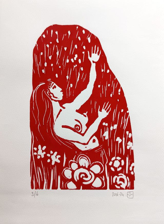 "champ, ode à la pluie", estampe de linogravure sur papier Tiepolo de Fabriano