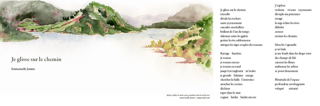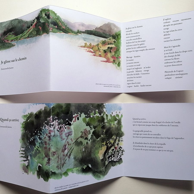 "Je glisse sur le chemin", Un leporello (petit livre plié) avec un dessin numérisé issu de mes carnets de bord et un de mes poèmes, plié en 3 et enveloppée dans une pochette individuelle, à s'offrir, ou à offrir, seul ou à glisser dans un cadeau plus important