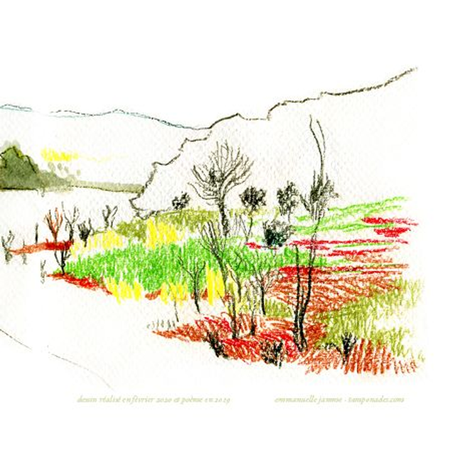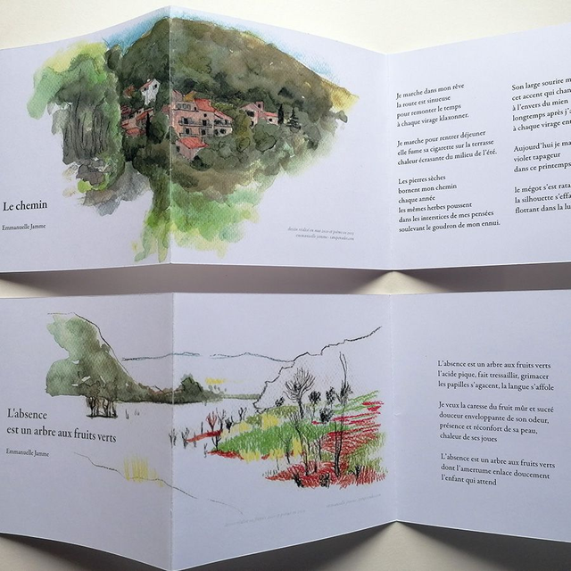 "L'absence est un arbre aux fruits verts", Un leporello (petit livre plié) avec un dessin numérisé issu de mes carnets de bord et un de mes poèmes, plié en 3 et enveloppée dans une pochette individuelle, à s'offrir, ou à offrir, seul ou à glisser dans un cadeau plus important