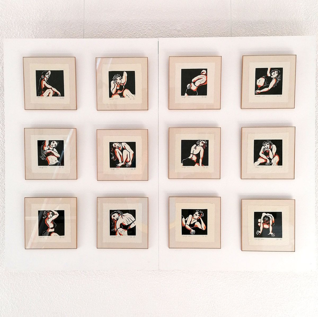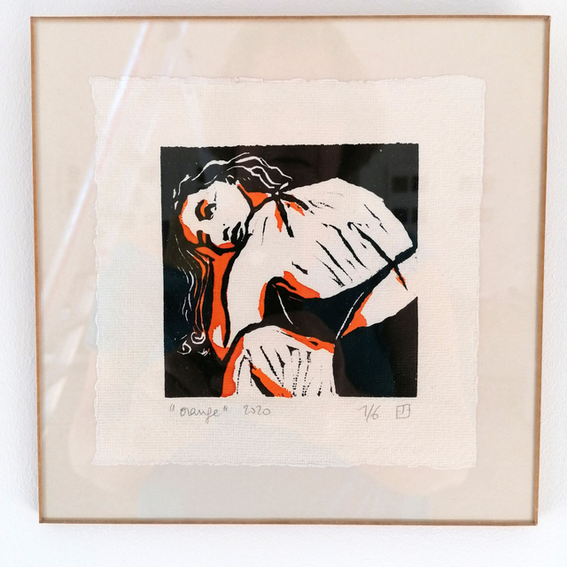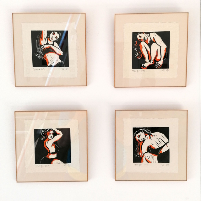 Série d'estampes de linogravures rehaussées à l'encre sur papier artisanal. Crées à partir de croquis de modèle vivant au moment du confinement. La modèle s'amusait à jouer de son image dans le cadre serré de l'écran d'ordinateur car nous étions en atelier à distance. J'ai voulu retranscrire cette singularité de mes croquis par le format carré. Tirage en 6 exemplaires