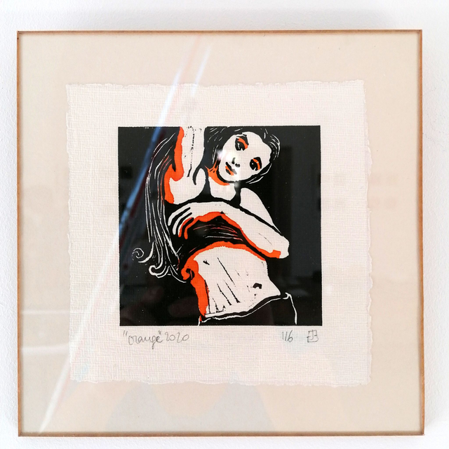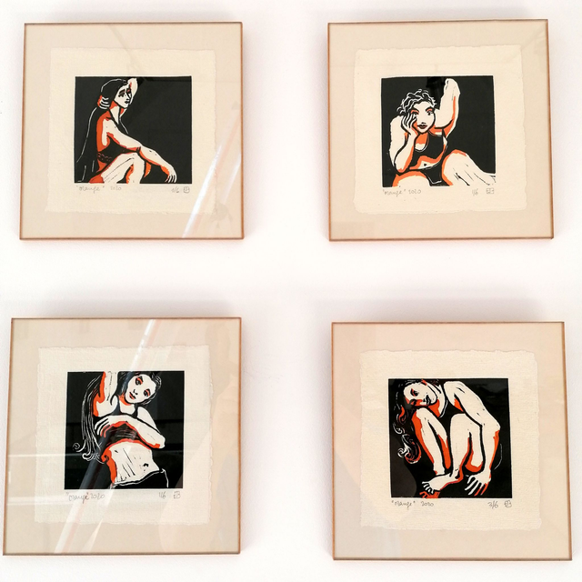 Série d'estampes de linogravures rehaussées à l'encre sur papier artisanal. Crées à partir de croquis de modèle vivant au moment du confinement. La modèle s'amusait à jouer de son image dans le cadre serré de l'écran d'ordinateur car nous étions en atelier à distance. J'ai voulu retranscrire cette singularité de mes croquis par le format carré. Tirage en 6 exemplaires