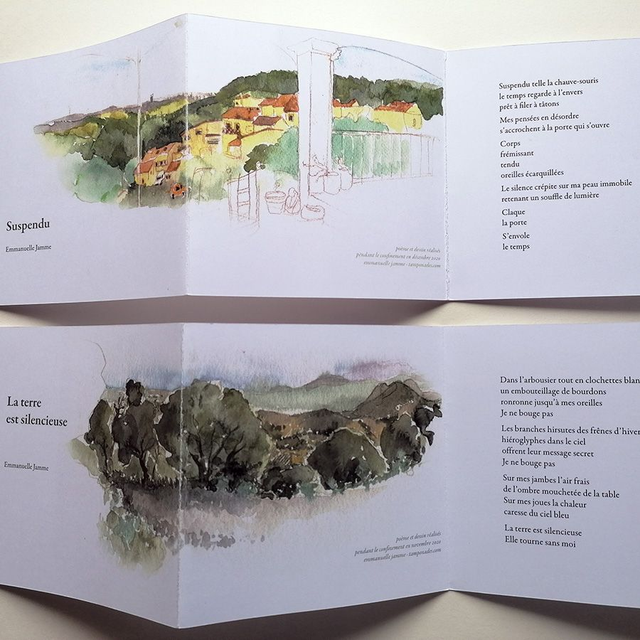 "Suspendu", Un leporello (petit livre plié) avec un dessin numérisé issu de mes carnets de bord et un de mes poèmes, plié en 3 et enveloppée dans une pochette individuelle, à s'offrir, ou à offrir, seul ou à glisser dans un cadeau plus important